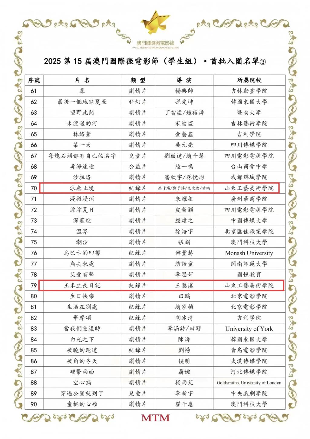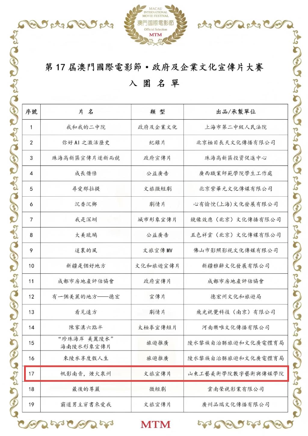 近日,澳门国际电影节入围名单正式揭晓,我校数字艺术与传媒学院选送的四部原创作品脱颖而出,成功斩获入围资格,实现微电影与政府与企业文化宣传片双赛道同步突围。