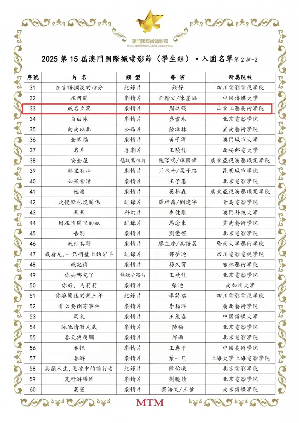 澳门国际电影节作为具有广泛国际影响力的专业影视赛事,赛事规格高、参赛作品数量多、行业竞争十分激烈。此次我校一举拿下四部入围名额,且实现双赛道覆盖,既是我校学子原创实力的集中彰显,更充分印证了学校在多元化影像创作领域的教学成效,凸显教学与创作相融、理论与实践并重的育人优势。