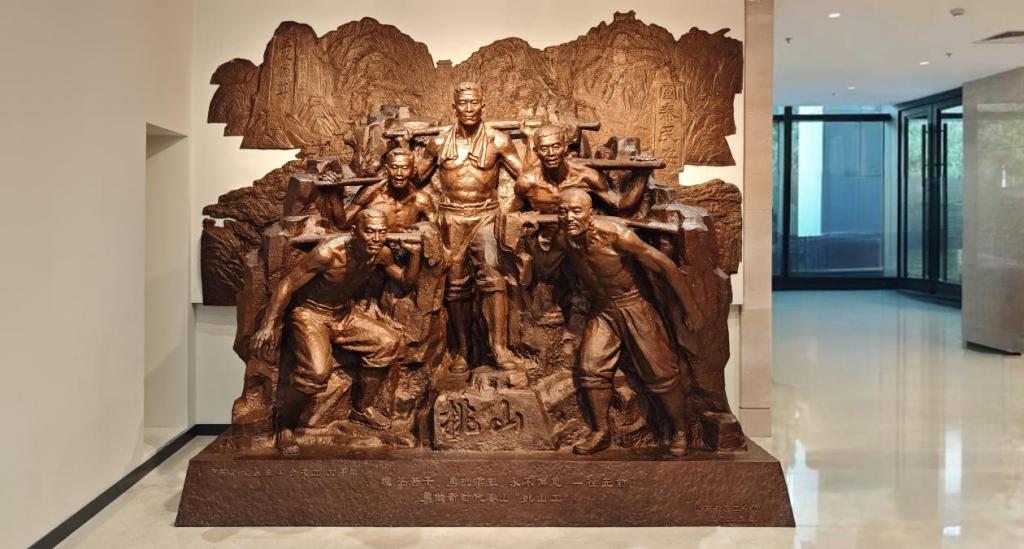 作品重达1.5吨,占地约5平方米,是展厅内体量最大的永久性藏品。其创造性地融合圆雕与浮雕技法:圆雕部分生动刻画了五位挑山工负重攀登的坚韧姿态;浮雕背景则勾勒出泰山十八盘的险峻及著名石刻,烘托出深厚的文化底蕴。